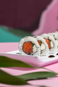 Rollo con salmón fresco, queso crema, cebollín, ajonjolí y salsa teriyaki. 10 piezas.